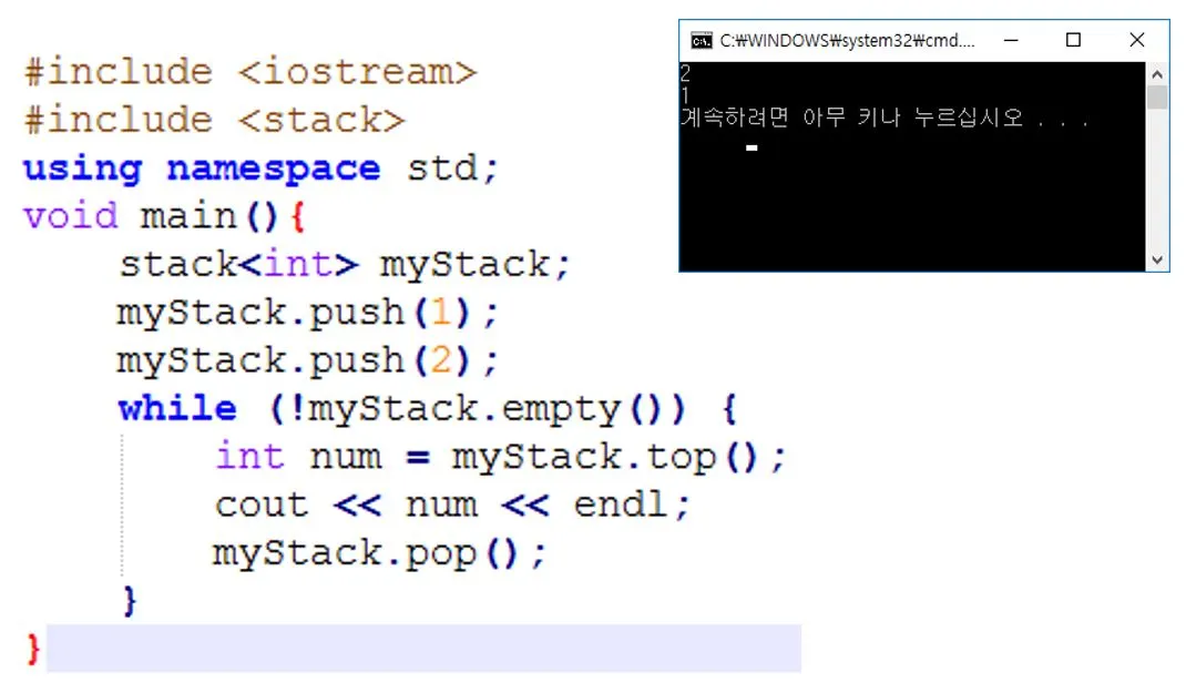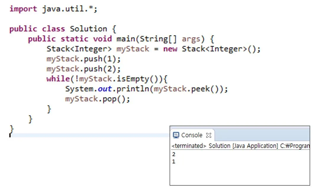 여기선 모든 데이터를 조회할 필요 없으므로 stack에 데이터가 없을 때까지 데이터를 모두 읽는 방식으로 코드를 작성했다. 각 언어마다 stack에서 데이터를 참조하는 방법이 다르다. C++ 은 top 함수로 java는 peek 함수로 데이터를 참조한다.
