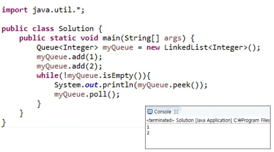 코드는 stack과 거의 비슷하다. 단지 자바에서는 LinkedList를 이용해서 Queue 자료구조를 만든 것이 그 차이인데 이는 클래스의 상속이라는 개념을 알아야 이해할 수 있으므로 우선 설명을 패스하겠다.
