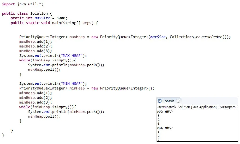 보면 우선순위 큐(PriorityQueue)를 이용해 MaxHeap 또는 MinHeap을 만든 것을 알 수 있다. C++은 우선순위 큐 기본이 MaxHeap인 반면 JAVA는 MinHeap이 기본이다.
