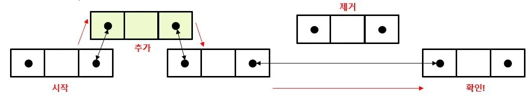 위처럼 양방향으로 위치를 기억하는 리스트를 더블 링크드리스트라고 한다. 이 리스트는 그림처럼 어느 위치에서도 삽입/제거가 빠르다. 단점도 있지 않을까?