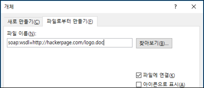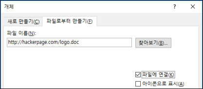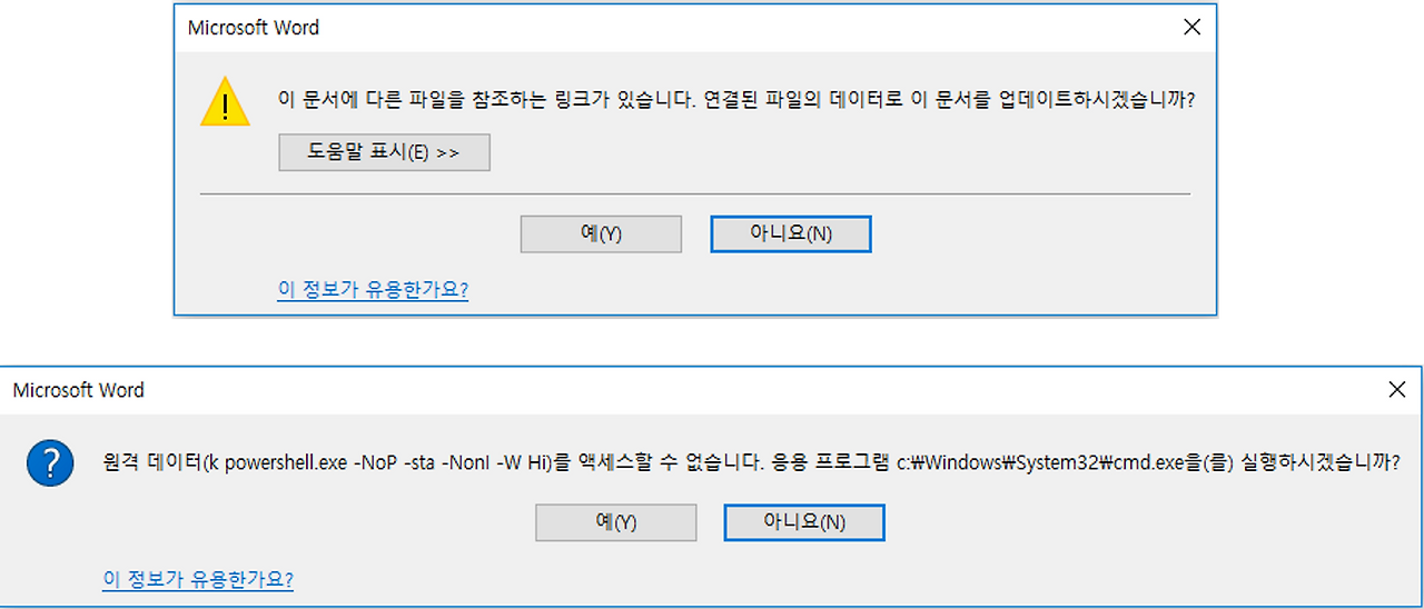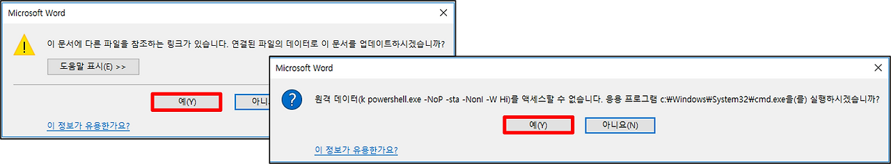 문서를 열 때 자동으로 외부링크에 대한 참조가 일어나 링크의 실행 여부를 묻는다. 사용자는 경고창을 무시하고 예(Y)버튼을 눌러 외부링크를 통해 악성바이너리가 다운로드되고 실행된다.