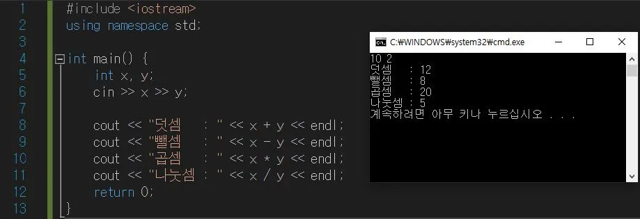 out의 반대는 in이므로 cin (console input의 줄임말)이 입력을 담당한다. cin을 통해 2개의 숫자를 입력받고 사칙연산 후 결과를 출력하는 프로그램을 만들어보자.