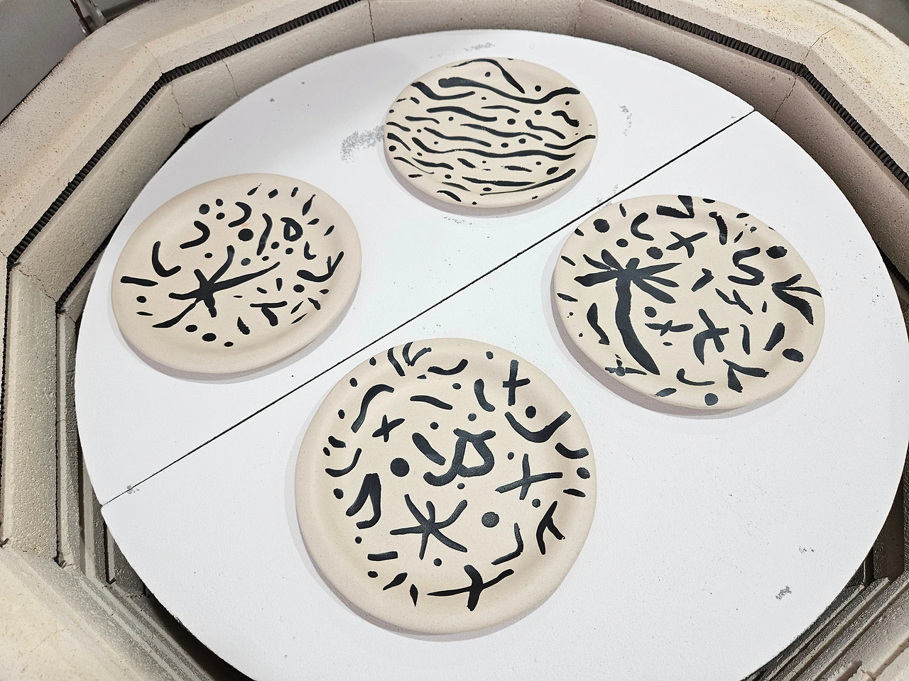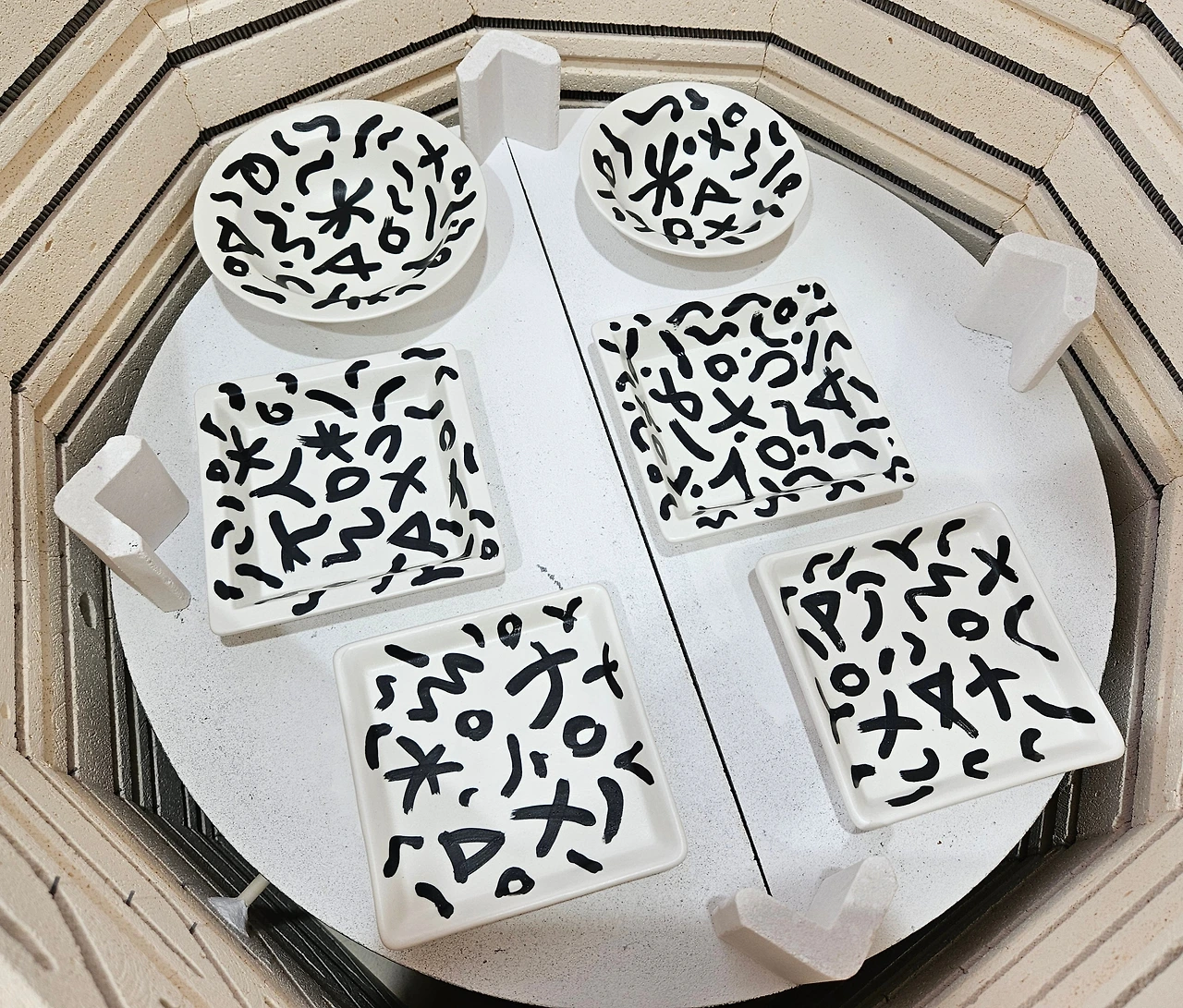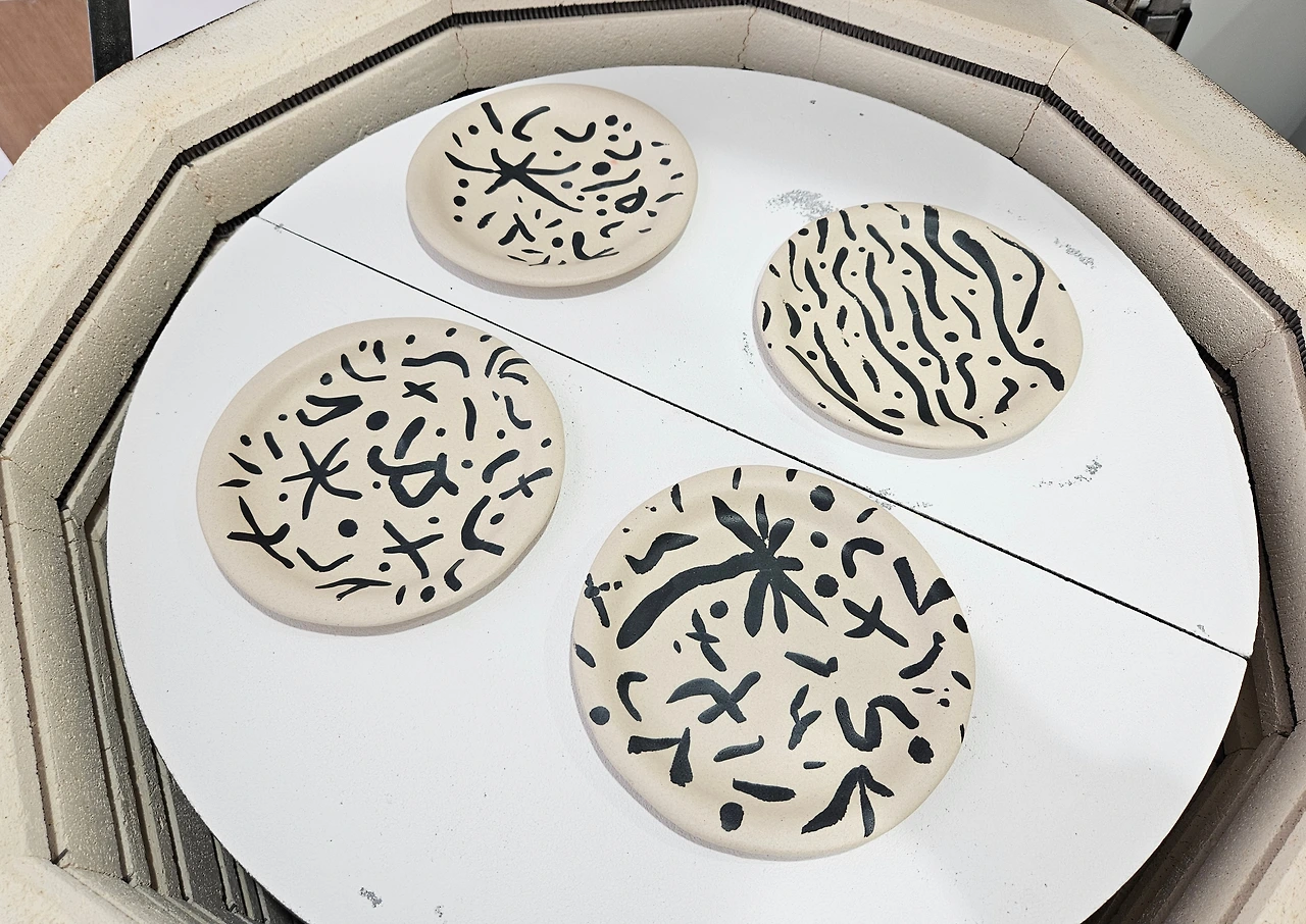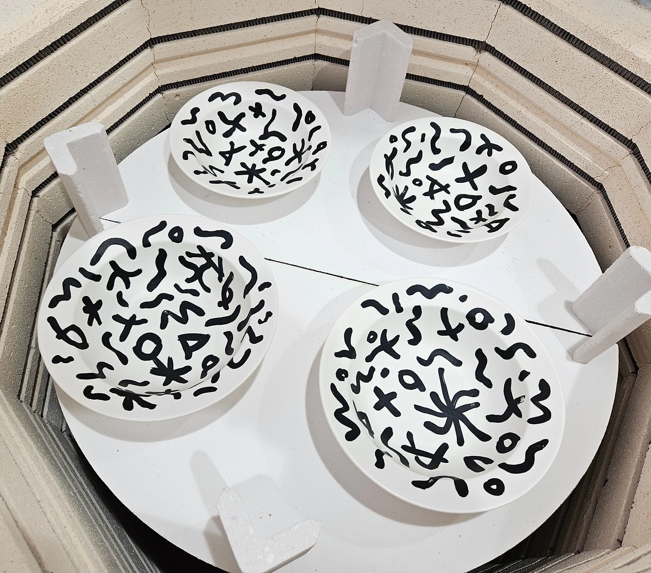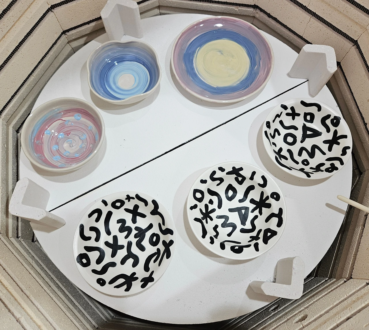 가마 맨 위의 드로잉 접시들은 직접 그린 건 아니고 색소지라는 색점토 검은색을 빚어 백자토에 드로잉 선대로 찍은 작업물입니다.