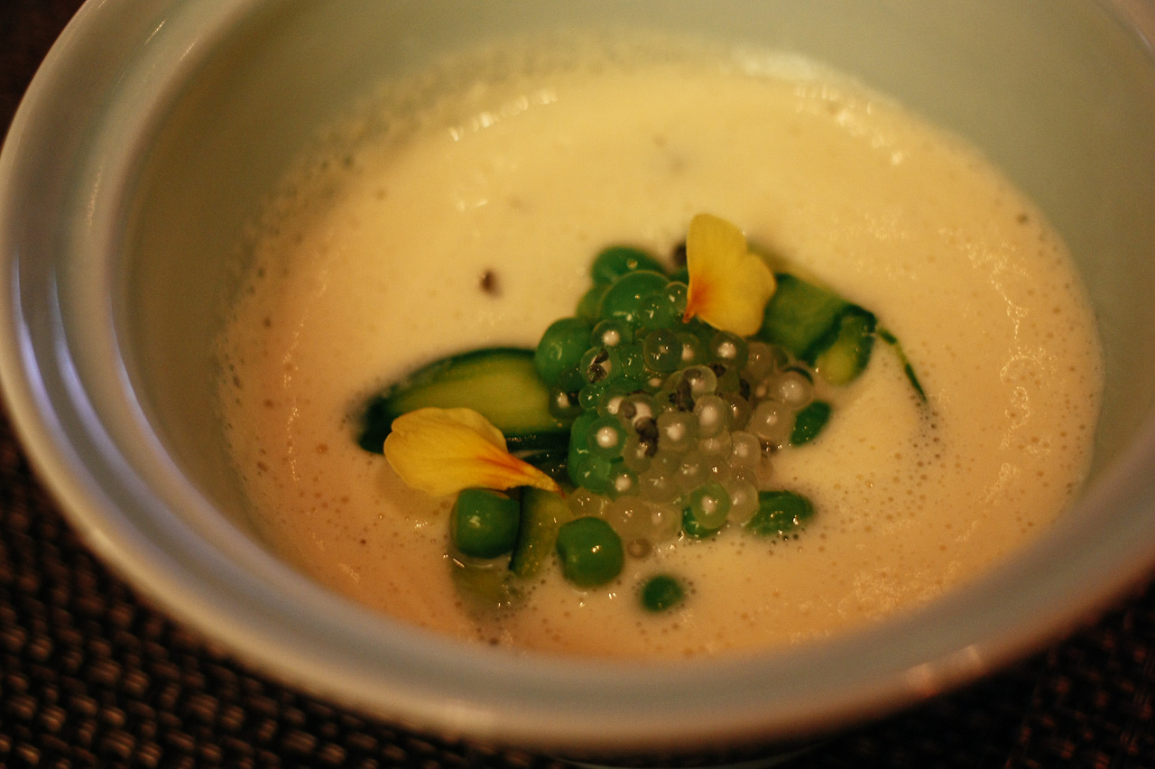 지인의 맛있는 곳을 소개해주겠다며 데려간 곳은 바로 이십사절기. 일식과 중식 그리고 양식을 쉽게 접할 수 있는 영국을 벗어나 한식 파인 다이닝을 먹이고 싶었다던 지인의 마음이 너무 귀엽고 고마웠다. 이십사절기의 저녁메뉴는 코스 요리 밖에 없다. 식전주전부리로는 찹쌀 옥수수와 견과류 그리고 밤고구마가 나온다. 그 다음에 차례대로 오이콩국수, 민어바케트와 침채, 먹새우감자튀김, 대통연잎흑돼지찜, 나물퓨레를 곁들인 연어요리, 나물밥비빔용 콩비지 찌개와 마지막으로 녹차 아이스크림과 커피가 나왔다. 이 코스는 총 두 시간에 걸쳐 서빙이 됐고, 우리는 모든 음식들의 플레이팅에 감탄을 자아냈던 기억이 난다.