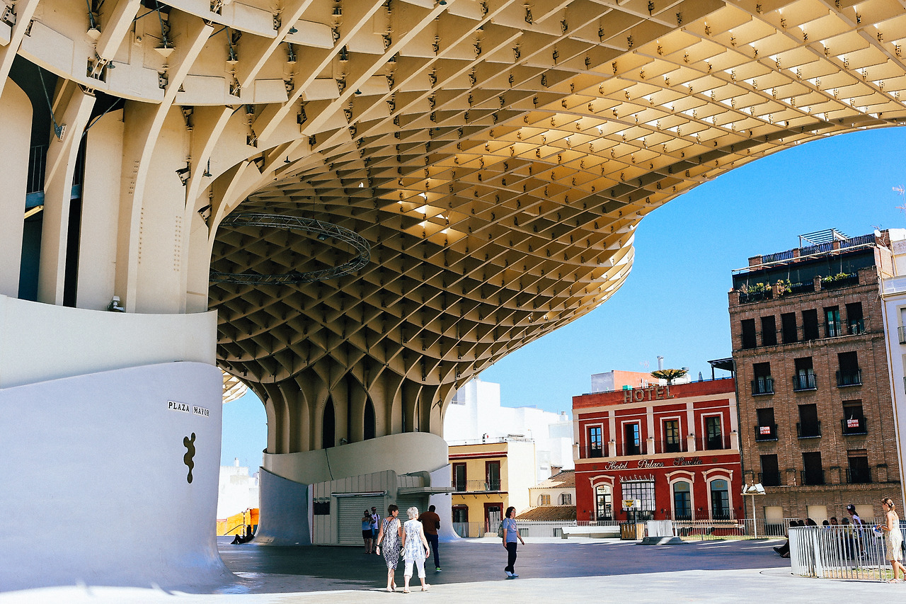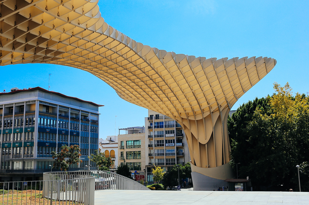 젤라또도 먹었으니 우리는 이제 본격적으로 시내를 구경하기로 했다. 세비야의 새로운 랜드마크인 메트로폴 파라솔로 향했다. 대성당에서 대략 13분 걸어야 하는 위치에 있다. 2011년 완공된 메트로 폴 파라솔은 엔카르나시 온 광장에 설치된 목조 구조물로 '거대한 팽이버섯'이라는 별명을 얻기도 했다. 입장료를 내고 옥상 위 산책로를 걸을 수 있다. 많은 여행자들이 세비야 야경을 보러 밤에 옥상을 올라간다고 한다.