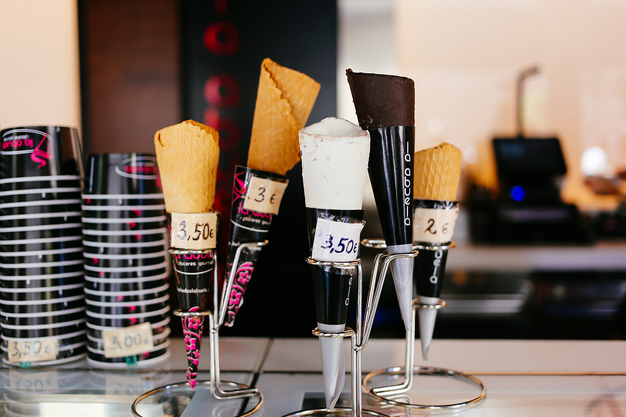 미듐 사이즈 컵은 3.5€. 세 가지 맛을 담을 수 있다.