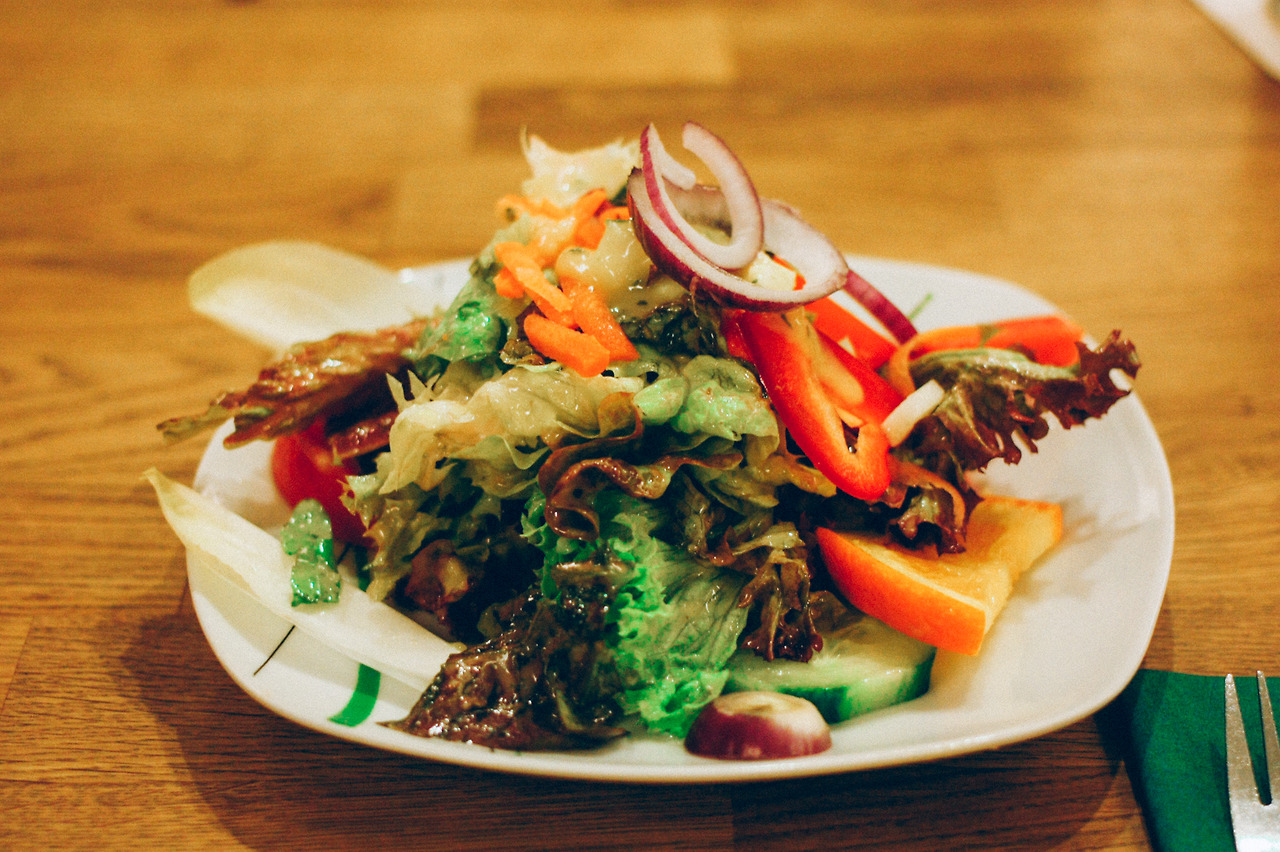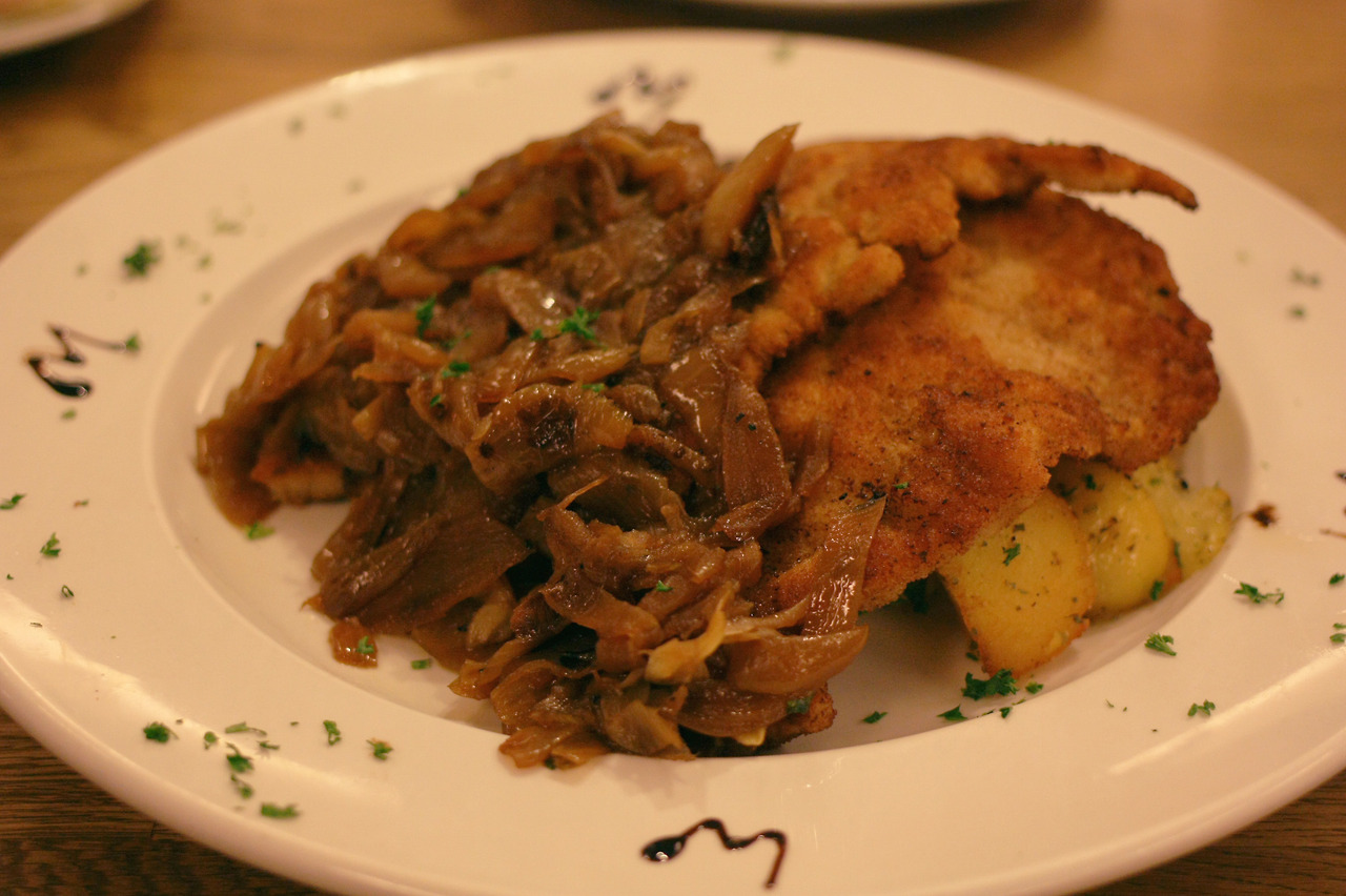 영문 메뉴가 없어서 나는 친구들에게 메뉴 추천을 받았다. 그들은 피그 뮐러 슈니첼 (Figlmüller-Schnitzel)을 추천해 주었다. 우리나라로 치면 돈가스이다. 원래 슈니첼은 돼지고기가 아니라 송아지 고기를 쓴다고 들었다. 사실 돈가스와 무엇이 다르냐 싶기도 한데, 돈가스 소스 대신 레몬즙과 소스에 절인 양파를 곁들어서 먹는 점이 다르다고 할 수 있다. 메뉴에는 샐러드도 포함되었다. 친구가 얘기하기를 샐러드 양이 굉장히 많고 재료도 싱싱하다고 해서 나는 기대에 부풀어 있었다.