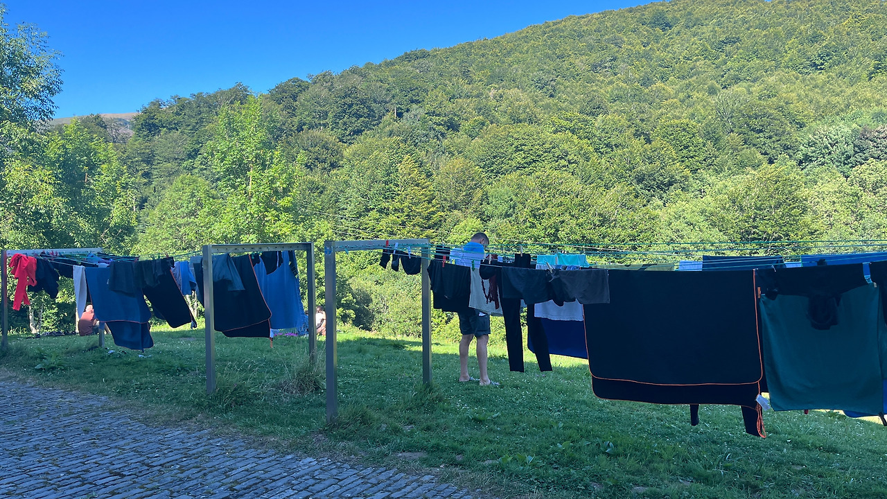 끝나지 않을 것만 같던 내리막길에 어이없는 웃음까지 나던 찰나, 드디어 목적지인 알베르게가 눈에 들어왔다. 한눈에 다 들어오지 않을 만큼 커다란 수도원은 영화에서 본 것 마냥 어딘지 모르게 신실한 에너지를 뿜내고 있었다. 샤워를 하고, 흠뻑 젖었던 옷을 빨아 건조대에 매달았다. 이곳에 도착하자마자 본 커다란 빨랫대에서 나는 왠지 모르게 자유로움을 느꼈다. 각종 탈것들이 넘쳐나는 이 시대에 이렇게 비효율적인 걷기를 실천하는 이들이 비움과 비움을 거듭해 남겨온 빨래 아닌가! 무소유 그 자체의 현장인 것만 같아 경이롭다고까지 표현하고 싶은 심정(?)이다.