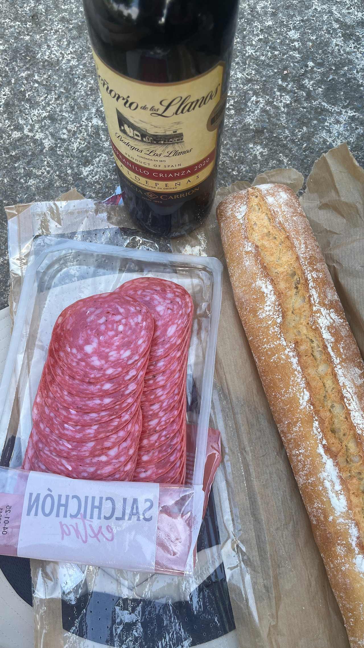 다음 마을에 도착해서 바닥에 점심을 펼쳤다. 순례길을 걷다 보니 내가 있는 곳이 어디든 나의 식탁이 된다. 훌륭한 풍경과 함께 초리조, 바케트 그리고 슈퍼에서 산 와인도 함께 곁들였다.