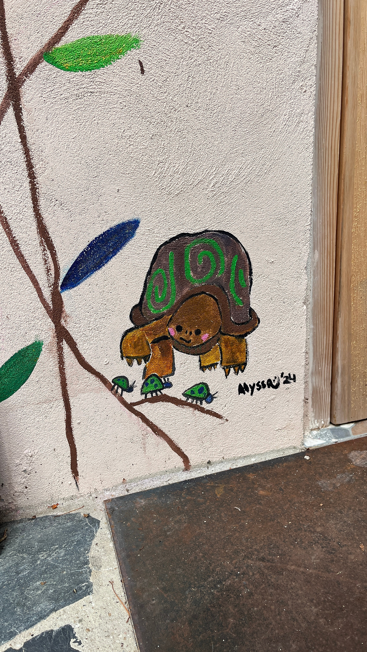 그렇게 길을 걷다가 목표한 알베르게에 도착했다. 그런데 허탈하게도 자리가 없었다. 순례길을 걸으며 정말 처음 있는 일이었다. 아쉽지만 아직 체력이 바닥난 것은 아니었으므로 다음 마을을 목표로 다시 걷기 시작했다. 또 다른 마을에 다다르자 눈에 보이는 알베르게에 바로 들어갔다. 입구에서부터 심상치 않은 분위기를 풍기는 이곳은 다행히도 자리가 넉넉히 남은 듯했다. 영어를 유창하게 구사하는 주인은 알베르게에 대해 자세히 안내해 주었다. 그렇게 1층을 둘러보던 중, 테라스에 나갔더니 너무 예쁜 그림들이 있었다. 이 알베르게에 머무르는 순례자들이 하나둘씩 그려두고 간 것이라고 했다. 하얀 벽이 참 아름답게 꾸며져 있었다. 이곳저곳을 구경하다가, 한국에 있는 나의 자매님이 좋아하는 거북이도 사진에 담아보았다. 세계 곳곳에서 온 여행객들의 손길이 이렇게 담겨있는 벽이라니, 이보다 소중한 인테리어가 있을 수 있을까.