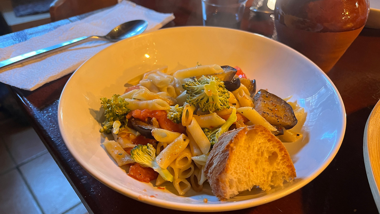 이어서 나온 메인은 야채 파스타였다. 간이 거의 되어있지 않았기 때문에 소금과 후추를 뿌려 먹었다. 구워진 채소와 파스타가 전부였지만 생전 처음 먹어보는 것처럼 그 맛은 대단했다. 디저트까지 야무지게 먹고 나니 배가 가득 찼다.