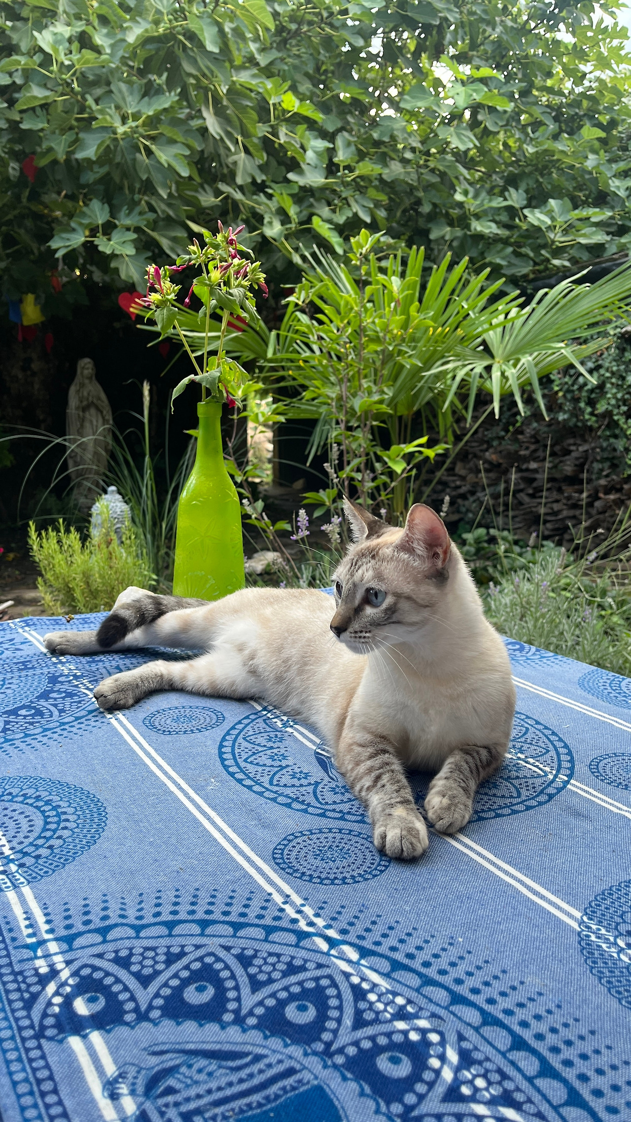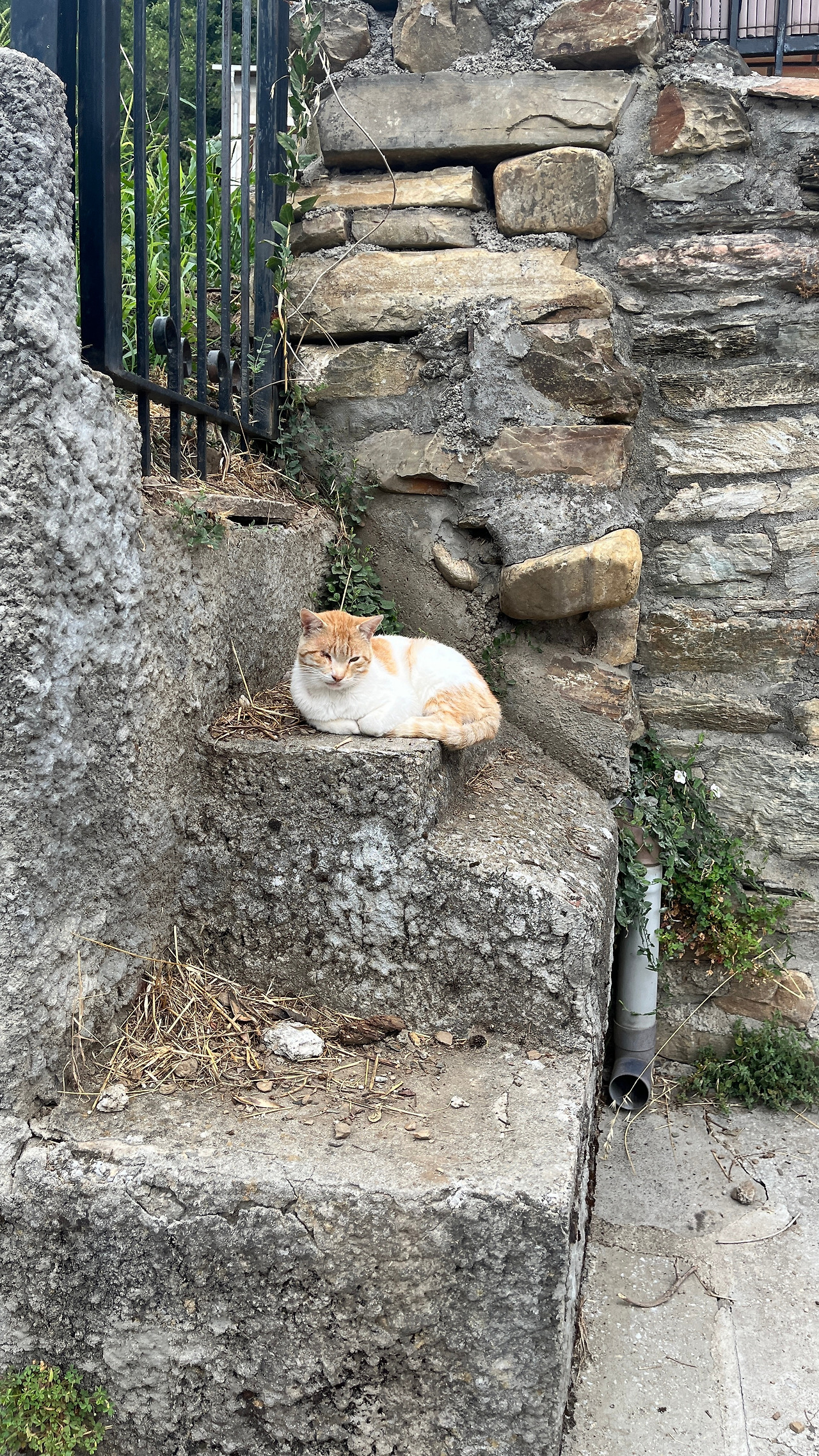 화분이 잔뜩 달린 집과 바닥에 앉아 잠을 청하는 고양이 하나, 고양이 둘 그리고 또 고양이.