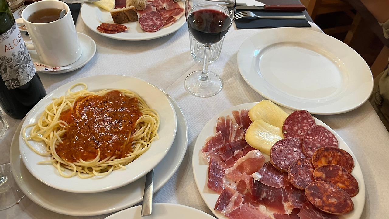 생각보다 더 마음에 들었던 숙소만큼, 저녁식사도 기대보다 훨씬 근사했다. 각 잡힌 테이블 세팅과 갓 오픈한 와인, 빵과 올리브유는 마치 도심 레스토랑에서 식사를 하는 듯한 모양새였다. 스타터로 초리조, 살치존, 하몽, 치즈 그리고 스파게티가 나왔고 메인으로는 닭고기와 소고기가 함께 나왔다. 양도 많고 맛도 있는 완벽한 식사였다.
