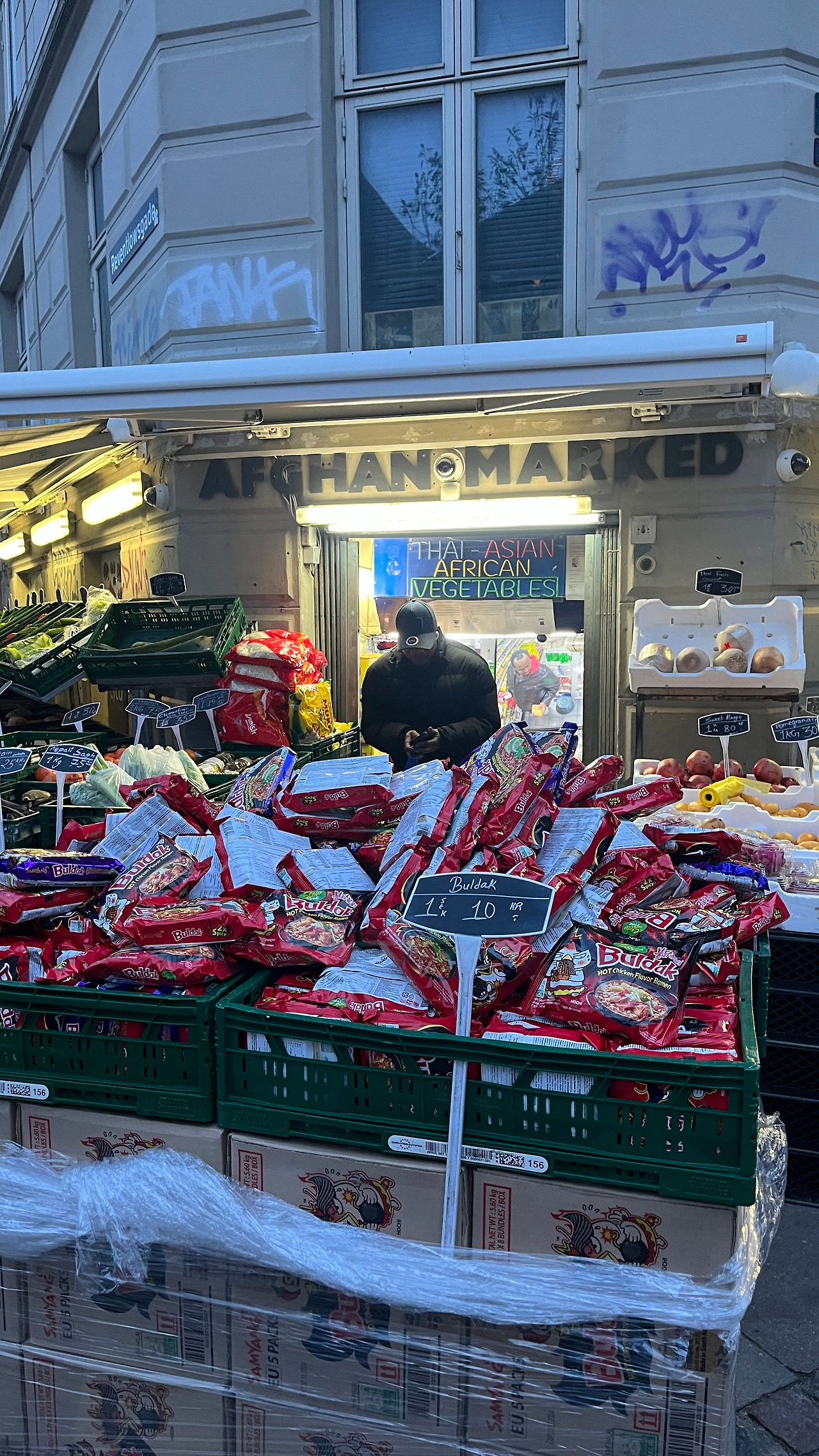 저녁장을 보기 위해 근처 마트로 향하다가 옆 골목에 있는 작은 아시안 마트를 발견했다. 마트 입구에 가장 크게 진열되어 있는 익숙한 물건이 눈을 사로잡았다. 작년이었을까, 덴마크 정부에서 불닭볶음면 제품 중 일부의 유통을 금지하는 소동이 있었다. 순례길을 걸으며 만난 덴마크 사람들에게도 그 이야기를 했던 기억이 떠올라 괜스레 더 웃음이 지어졌다.