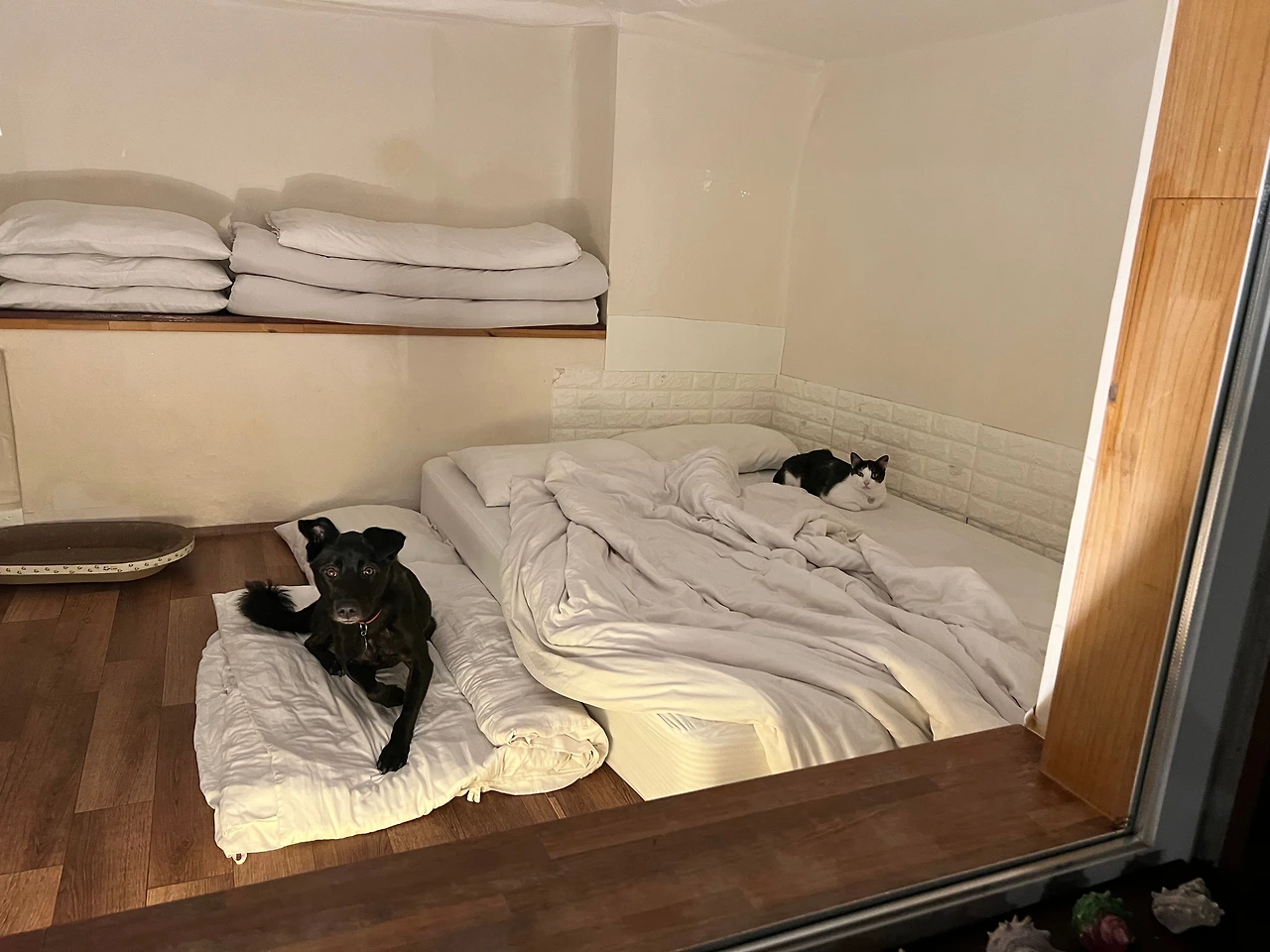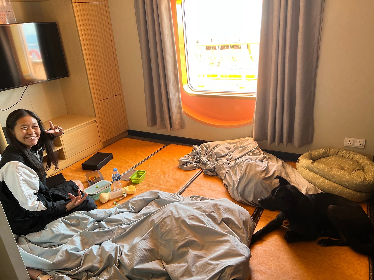 작년 탄 배는 대형견은 배에서도 차에 있어야 했다. 혼자 시끄러운 곳에 있던 지미의 원망이 가득한 눈빛을 보고는 이번에는 스페셜 펫룸을 선택한다. 고양이 금치, 강아지와 단독룸에서 쉬어갈 수 있다. 밤샘 운전으로 지친 할망, 할방도 쉬어간다.