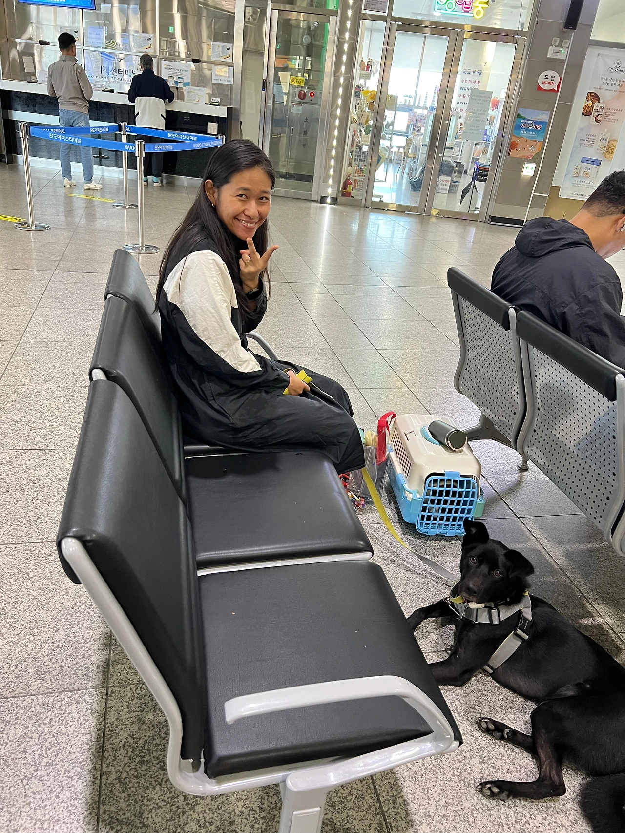 대형견은 배 안에서 이동할 때 입마개가 필수. 참. 쉽지 않다. 안 그래도 무서워서 헥헥거리는데 숨 쉬기가 더 어려워진다. 대형견 케이지도 들고 타라는데. 어찌나 크고 무거운지 대형견 켄넬은 들고 다니는 용이 아닙니다만. 그래도 함께 탈 수 있음에 감사하며.