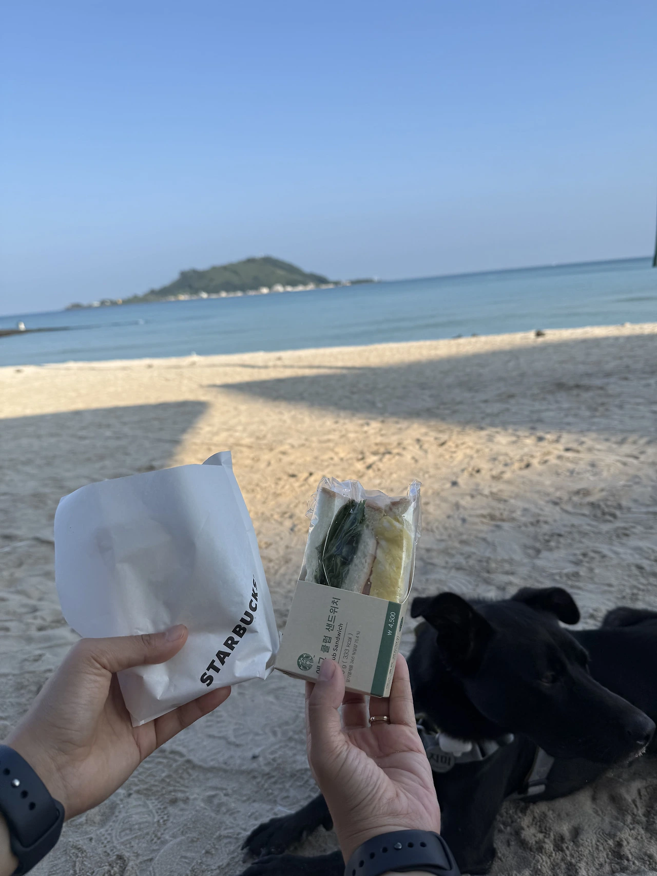 아침러닝 후 샌드위치와 오트라테. 뉴요커를 따라 해본다. 러닝 하면서 만난 야영 패밀리들. 한국도 이렇게 평화로울 수 있다니! 정말 대형견이 많다. 지미는 제주에서는 중형견이 되는 매직.