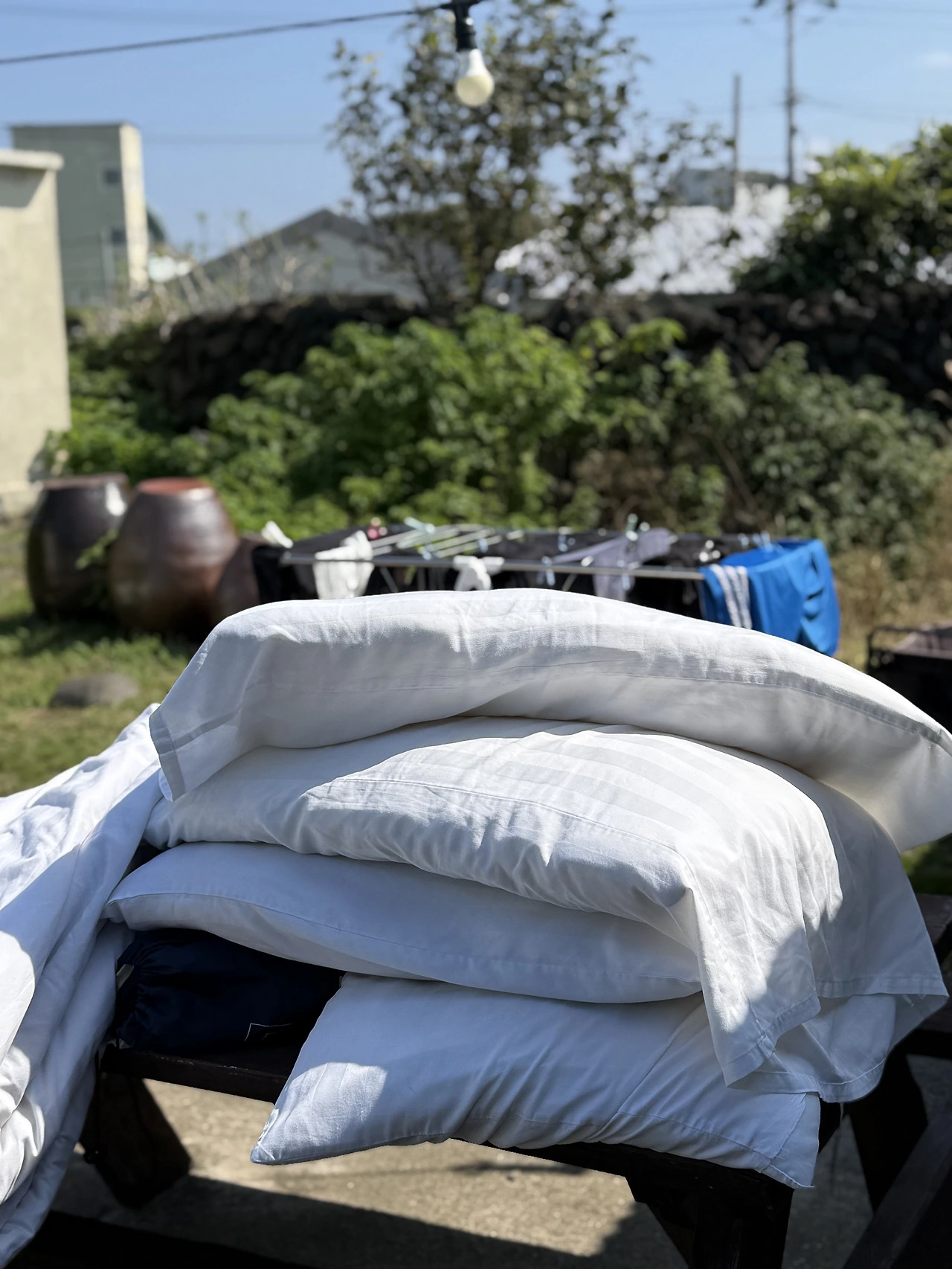 오늘 오는 졔와 쥰을 맞이하기 위해 이불을 마당에서 탈탈 턴다. 와. 햇살 가득한 마당에서 이불을 터니 이렇게 행복할 수 없다. 어마어마하게 많은 고양이, 강아지가 내뿜는 털들이 싹 털리는 기분이랄까.