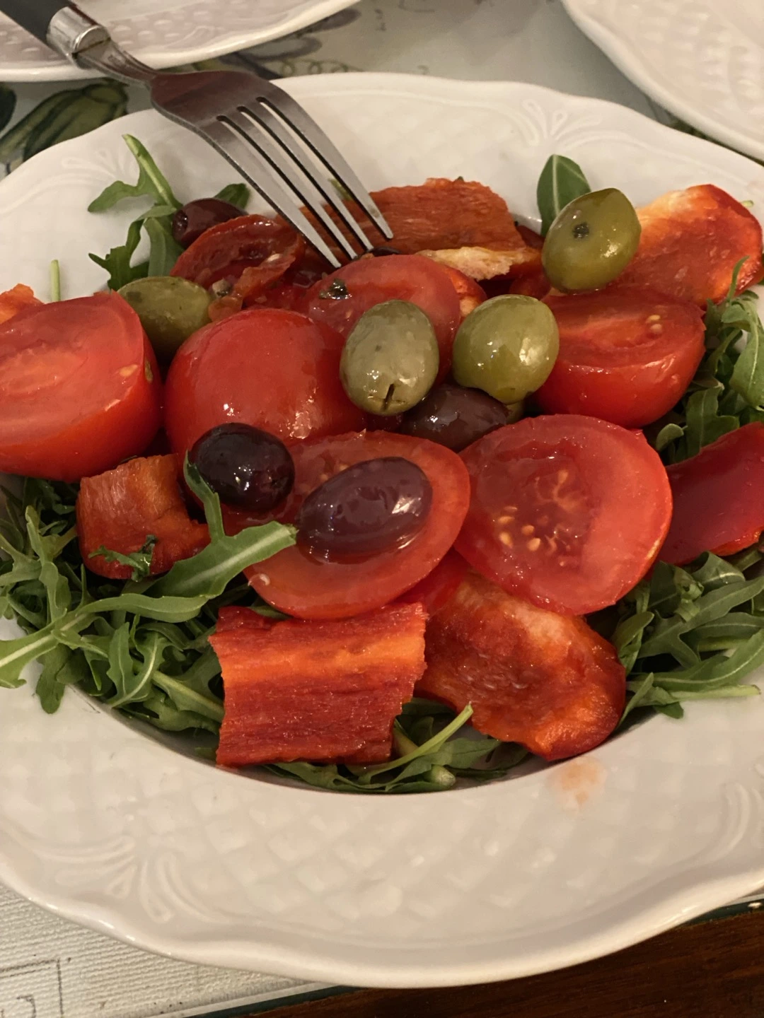 루꼴라에 토마토, 파프리카, 절인 올리브를 올리고, 올리브유, 레몬즙을 휘리릭 두른 루꼴라 샐러드.