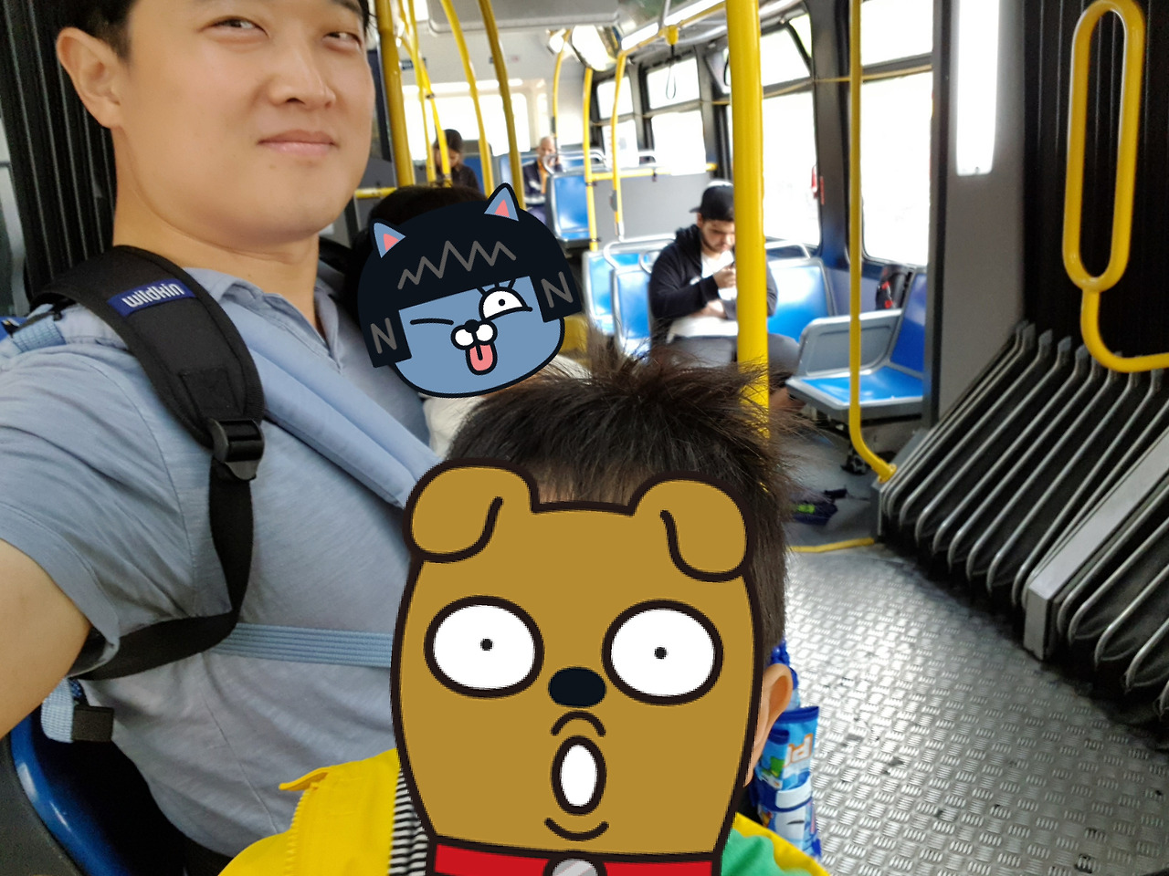 아이를 안고 버스에 오르면 그다음부터는 대체로 수월합니다. 아이가 있는 걸 보면 대개는 자리를 양보해 주시거든요. 그럼 버스 구석 벽면에 유모차를 세워두고자리에 앉곤 합니다.