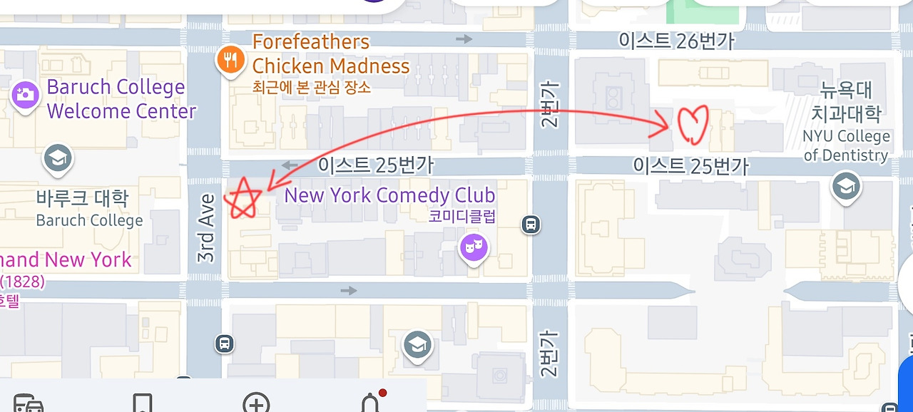 정답은 3번가를 타고 한 블록 올라가서, 26가를 타고 오른쪽으로 한 블록만 가고, 2번가를 타고 세 블록 내려와서, 23가를 타고 오른쪽으로 한 블록 가고, 1번가를 타고 두 블록 올라온 다음, 25가를 타고 왼쪽으로 한 블록 들어가면 됩니다. 드디어 도착했네요! 이게 도대체 뭐냐 싶지 않으신가요?