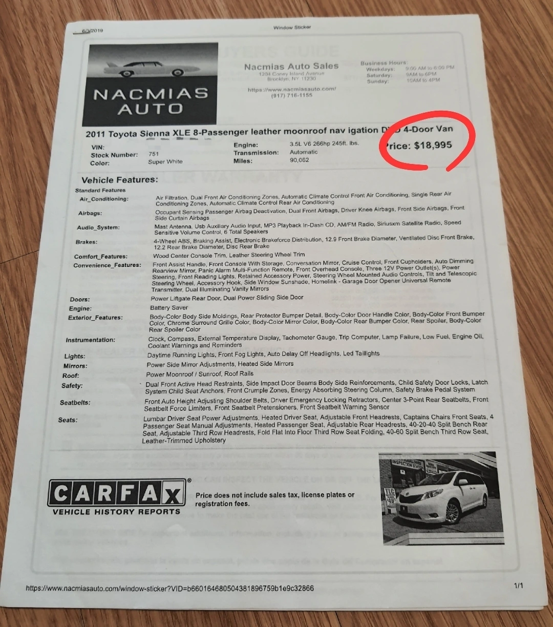 그래서 '가격이 얼마냐, 나 옵션은 필요 없고 저렴한 거 원하는데 이건 나한테 안 맞지만,' 이거 강조했죠 '안 맞는 건데 그래도 싸면 고려해 볼게 얼만데?' 했더니 18,995달러를 부르는 거예요. 미국 중고차는 '윈도우 프라이스'라고 해서 창문에 사양이랑 가격을 적어놓거든요. 물론 흥정을 시작하는 가격이니까 당연히 그 값에는 안 삽니다만.