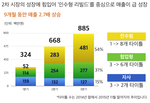 2015년 모바일 게임 2차 시장규모는 218억엔(약 2218억원)이지만, 2017년에는 1000억엔(약 1조176억원)을 돌파할 것으로 보입니다.