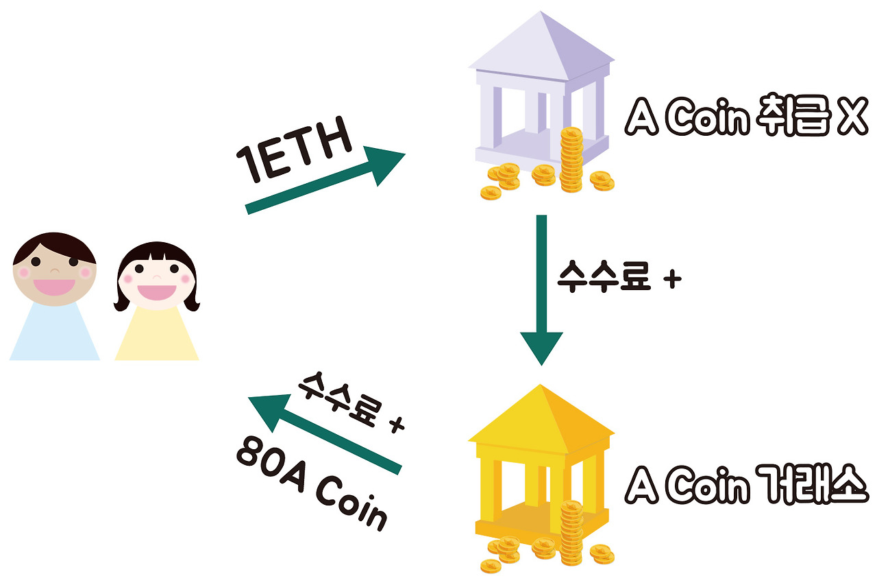 예를 들어 자신의 주 거래소에서 A코인을 취급하지 않는다면 사용자는 A코인이 있는 또 다른 거래소에 계정 및 지갑을 만들고, 주 거래소에서 이더리움(또는 비트코인)을 전송해 자산을 옮긴 뒤 새로운 거래소에서 A코인으로 바꾸는 과정을 거쳐야 하기 때문에 수수료와 시간이 이중으로 들게 됩니다.