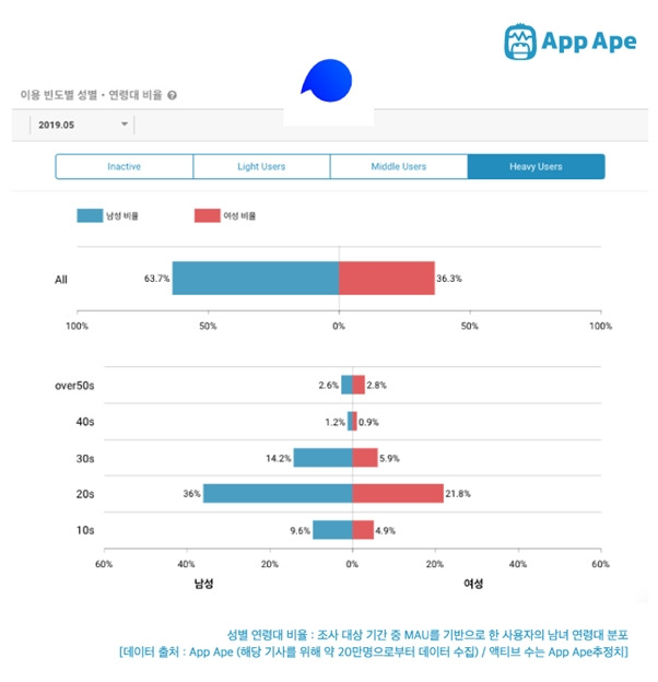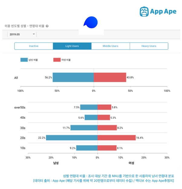 헤비 유저층도 ‘토스’보다는 고르게 분포한 편입니다. 20대 남성은 ‘토스’에 비해 헤비 사용자층이 많이 적었고, 오히려 30대 남성은 높은 비율을 차지했습니다. 또한 전체적으로 라이트 유저 비율과 달리 여성 사용자가 8% 정도 증가했다는 특징이 있는데요. 그중에서도 20대 여성이 10%가량 늘었습니다.