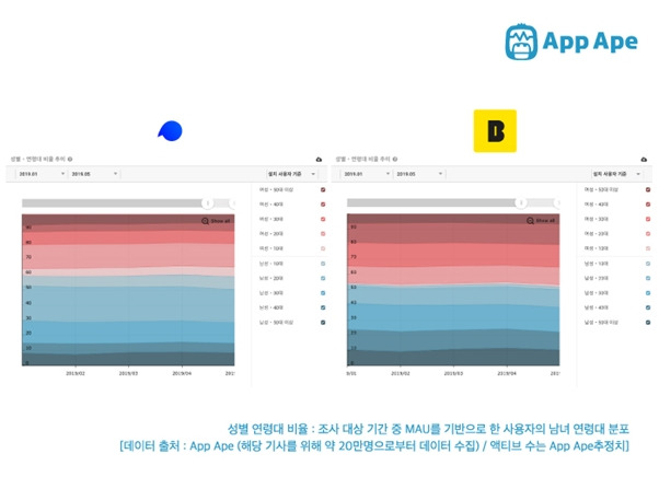반면 우측의 ‘카카오뱅크’ 그래프는 오히려 시작할 때부터 10대층을 제외하고는 비교적 각 연령층이 고루 잘 드러 났고, 시간이 지날수록 여성 사용자가 증가해 가는 모양새를 띄고 있습니다.