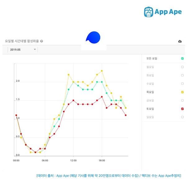 그래프를 보면, 확실히 간편 결제 및 송금의 용도로 점심과 저녁을 먹고 많은 사람이 앱을 사용하는 것을 추측할 수 있습니다.