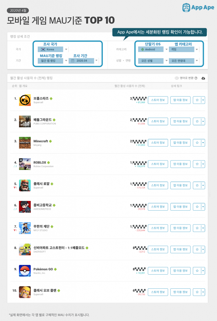 지난 3월 대비 새롭게 순위에 들어온 게임 앱은 없습니다. ‘ROBLOX’와 ‘좀비고등학교’가 한 단계씩 상승한 모습을 볼 수 있습니다.