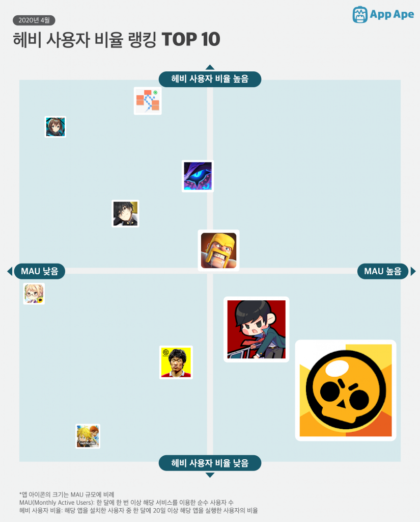 지난 3월과 마찬가지로, MAU 랭킹의 상위권은 지난달과 비슷한 앱들이 자리를 지켰지만, 헤비 사용자 비율 랭킹에서 변화가 있었습니다. ‘브롤스타즈’와 ‘일곱 개의 대죄: GRAND CROSS’, 그리고 ‘AFK 아레나’는 4월 이벤트로 인해 월 20일 이상 접속한 헤비 사용자가 상승한 것을 볼 수 있었으며, ‘로드 오브 히어로즈’는 출시와 동시에 헤비 사용자 순위 4위에 등극하였습니다.