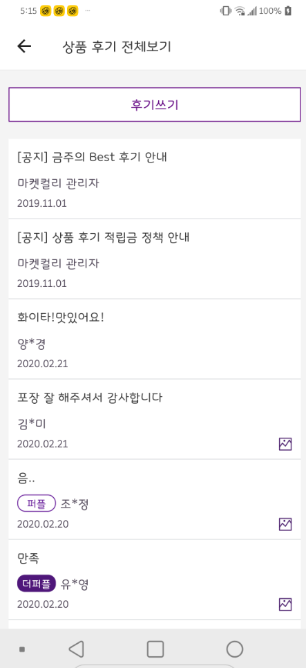 텍스트 위주의 후기만 제공하는 것은 사용자가 좀 더 리뷰를 성실하게 작성하기 위한 의도로 보인다. 실제로도 몇몇 사용자는 구입한 식재료로 어떤 요리를 했는지 상세하게 정리할 정도로 커뮤니티적인 느낌을 받는다. 그것이 실제로 구매하도록 유도할 때가 많다. 다만 후기가 최신순으로 정렬되어 있어(베스트 제외) 긍정적인 리뷰와 부정적인 후기를 구분하기 어렵게 만든다. 이를 별점 방식을 통해 4~5점은 긍정, 3점은 보통, 1~2점은 부정으로 구분하면 원하는 후기를 선별해서 볼 수 있지 않을까 싶다. 설문 방식으로 간편하게 후기를 응답할 수 있는 방식을 제공한다면 더 많은 사용자가 후기를 적극 작성할 수 있을 것이다.