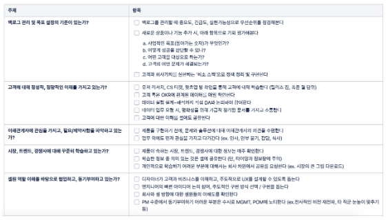 그리고 주제마다 파생되는 구체적인 항목을 달아서 PM 스스로 체크해볼 수 있도록 했다. (물론 각 항목들도 책의 내용을 기반으로 한다) 아래는 두 번째 주제에 대해 PM들에 전달한 항목을 예시로 적었다.