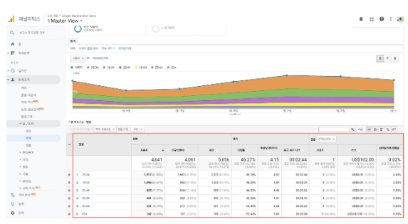 자, 우리는 전환율을 기준으로 의사결정을 해야 한다고 말씀드렸습니다. 지금 우리 브랜드에서 결제로 이어지는 전환율이 상대적으로 가장 높은 고품질 유저는 어느 연령대인가요? 바로 [35-44세] 연령대의 전환율이 4.37%로 매우 높습니다. 여기서 우리는 문제점을 찾아내야 합니다. 지금 전환율이 가장 높은 35-44세 연령대가 전체 사용자수가 3순위로, [25-34세 연령대] , [18-24세 연령대] 보다 훨씬 더 적습니다. 전환율이 높은 고품질 유저가 많이 들어와야 결제 완료로 이어지는 수가 많을 텐데, 고품질 유저인 [35-44세 연령대]가 3순위라니, 문제가 있습니다. 우리는 여기서 문제점을 발견했다면, 이 문제점을 해결하기 위해 무엇을 할 수 있을까요?