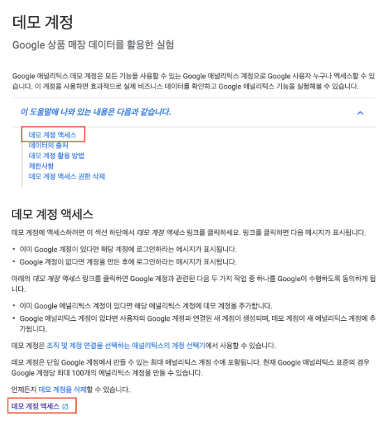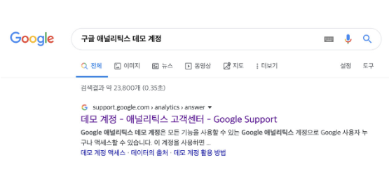 이 글을 읽고 계신 여러분은, 여러분들만의 웹사이트가 없을 수도 있고, 웹사이트에 아직 구글 애널리틱스가 설치되어 있지 않을 수 있습니다. 이러한 분들을 위해서 , 구글에서는 구글 애널리틱스 데모 계정을 제공해주고 있으며, 이 데모 계정은 구글의 가상 쇼핑몰인 Google Merchandise Store의 데이터를 실시간으로 보내고, 여러분들이 직접 쌓여있는 데이터들을 볼 수 있도록 설정합니다. 다 함께 구글 창에 [구글 애널리틱스 데모 계정]이라고 검색해봅시다. 그러면 Google Support에서 지원해주는 구글 애널리틱스 데모 계정이 나타납니다. 이 쪽으로 들어가 봅시다.