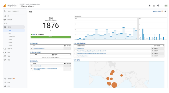 1) 실시간 : [실시간] 카테고리는 말 그대로 지금 이 순간 우리 웹사이트에 어떤 사람들이 어디서 들어왔고, 지금 우리 웹사이트에서 어느 위치에 머무르고 있는지를 실시간으로 보여주는 리포트입니다.
