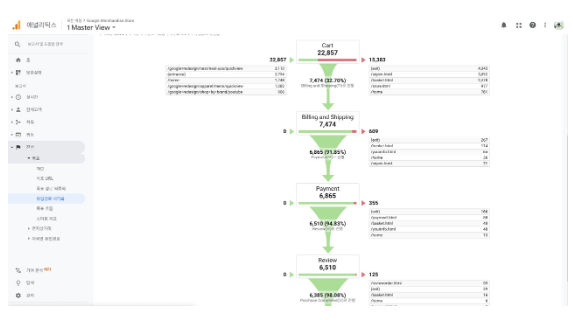 유입 경로 시각화는 이전까지의 테이블 형식의 데이터가 아닌, 시각화된 데이터를 보여주고 있습니다. Purchase Completed라는 목표로 설정을 했을 때, 장바구니 페이지 – 배송 정보 입력 페이지 – 결제 시작 페이지 – 후기 작성 페이지까지의 경로별 전환율과 이탈률이 나타납니다. 보시다시피, 장바구니 페이지에서 이탈률이 심각하게 발생하고 있습니다. 이상하죠. 장바구니 페이지는 거의 구매 결정을 내린 곳임에도 불구하고, 이탈률이 높습니다. 상품 가격이 너무 비싼 것은 아닌지, 장바구니를 담고 다음 단계로 이동하는 버튼이 찾기 어려운 것은 아니지 등등의 UI적 , 기획적 고려를 해볼 수 있습니다.