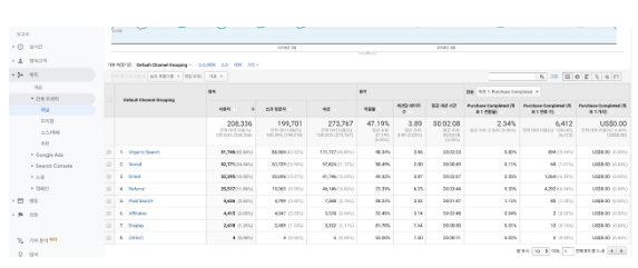 이번에는 측정 기준의 이름이 [Default Channel Grouping]이라고 되어있고, 그다음 열부터는 측정항목들이 그대로 들어옵니다. [Default Channel Grouping] 란, 구글 애널리틱스에서 기본적으로 분류해놓은 채널들을 의미합니다. 한 가지씩 살펴봅시다.
