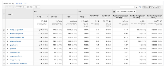 자, 8가지의 채널을 간단히 설명드려보았는데, 지금 전환율이 가장 높은 채널은 어디인가요? 네, 9.3%의 높은 전환율을 기록하고 있는 Referral 채널입니다. 어딘가의 사이트에서 추천되어서 들어오는 트래픽의 전환율이 매우 높다는 것인데요. 그럼 도대체 어떤 사이트인지, Referral 측정기준을 클릭해봅시다. 그러면 Referral 채널에 집계된 다양한 추천사이트들의 URL이 나타납니다.