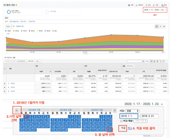 해석하기 전 우리의 화면을 모두 통일시키기 위해, 옛날 데이터를 충분히 조회할 것입니다. 2가지 세팅을 해봅시다. 첫 번째는, 날짜 세팅입니다. 보이시는 화면에서 가장 오른쪽 상단에 날짜가 있을 텐데, 시작 날짜와 끝나는 날짜를, 2018년 1월 1일부터 2018년 3월 31일까지 세팅해줍시다.