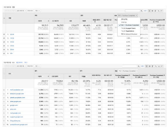 그리고 다시 아래로 내려오면 표의 가장 오른쪽 부분에 [전자 상거래]라고 있습니다. 이 [전자 상거래]라고 되어있는 부분을 눌러, [목표 1: Purchase Completed]라고 되어있는 항목을 선택합시다.