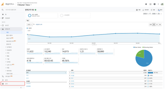 자세한 세팅은 다루지 않고, 구글 애널리틱스의 데이터를 맛볼 것이기 때문에, 왼쪽 최하단에 있는 톱니바퀴 모양의 [관리] 버튼을 클릭하여, 구글 애널리틱스의 홈 화면으로 이동합니다.
