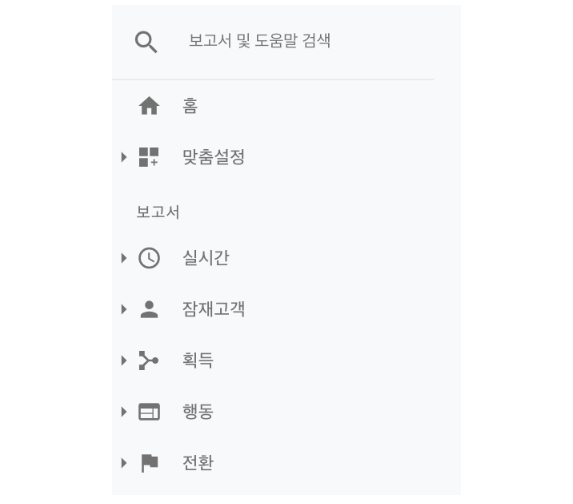 계정, 속성, 보기에 대한 설명은 여기까지만 하고, 이제 우선 데이터를 조회하는 방법을 알아보기 위해, 보이시는 화면에서 왼쪽 메뉴의 빈 공간을 눌러봅시다. 그러면, 보고서로 이동할 수 있는 메뉴가 펼쳐집니다. [보고서]라는 카테고리의 메뉴는 총 5가지가 있습니다. 그리고 해당 5가지를 눌러보면, 각각 카테고리에 맞는 상세 리포트들이 있는 것을 보실 수 있습니다. 5가지 메뉴를 살펴봅시다.
