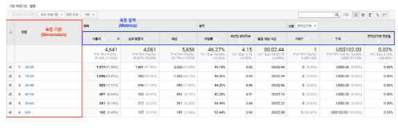우리는 [연령] 리포트에 들어왔으니, 당연히 가장 왼쪽엔 [연령]이라고 표시되어 있습니다. 이렇게 테이블의 가장 첫 번째 열에 있는 것을 데이터를 측정하는 데에 있어 기준점이 된다고 하여, 측정기준, 영어로는 차원을 뜻하는 Dimension이라고 부릅니다. 그리고 측정기준 옆에 숫자로 표시할 수 있는 모든 지표들을 측정의 대상 또는 항목이 된다고 하여, 측정 항목, 영어로는 Metrics라고 부릅니다. 구글 애널리틱스에서 제공하는 모든 테이블 형태는 이렇게 측정 기준(Dimension)과 측정 항목(Metrics)으로 구성되어 있습니다. 자 백문이 불여일견이니, 제가 약간 랩 하듯이, 이 테이블 표의 첫 번째 항목을 해석해보겠습니다.