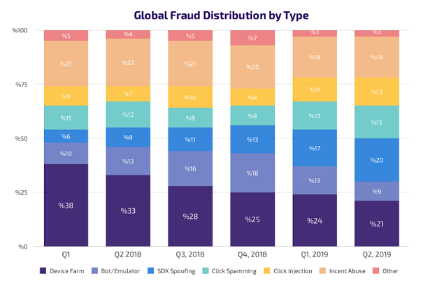 이러한 SDK 스푸핑은 모든 Ad Fraud의 유형 중 가장 빠르고 지속적으로 증가하고 있으며, 그림에서 보다시피 2019년 1분기에서 2019년 2분기까지 17%에서 20%로 증가했습니다.