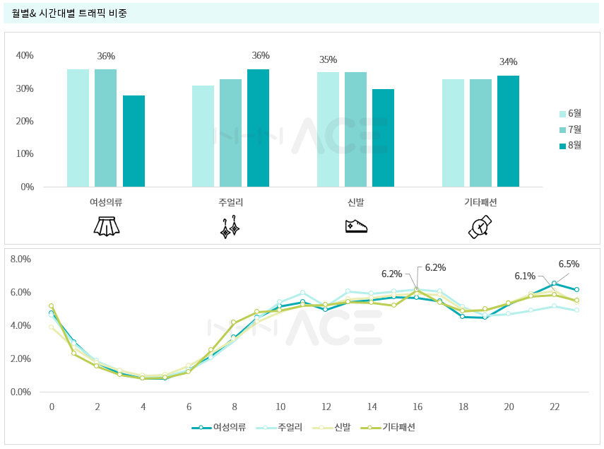 여성의류와 신발은 3,4,5월 트래픽이 비슷했던 봄 시즌과는 달리 6,7월에 방문자가 높게 나타났으며 상대적으로 8월에는 방문이 줄어드는 것으로 분석되었습니다. 반대로 주얼리는 8월에 방문이 가장 높은 것으로 나타났는데요, 옷차림이 가벼워질수록 포인트를 줄 수 있는 주얼리에 관심도가 높아지는 것으로 보입니다.