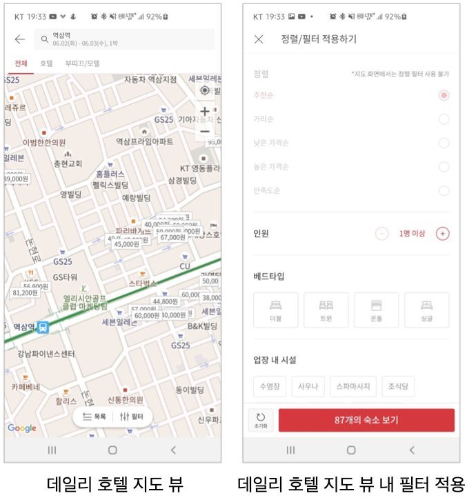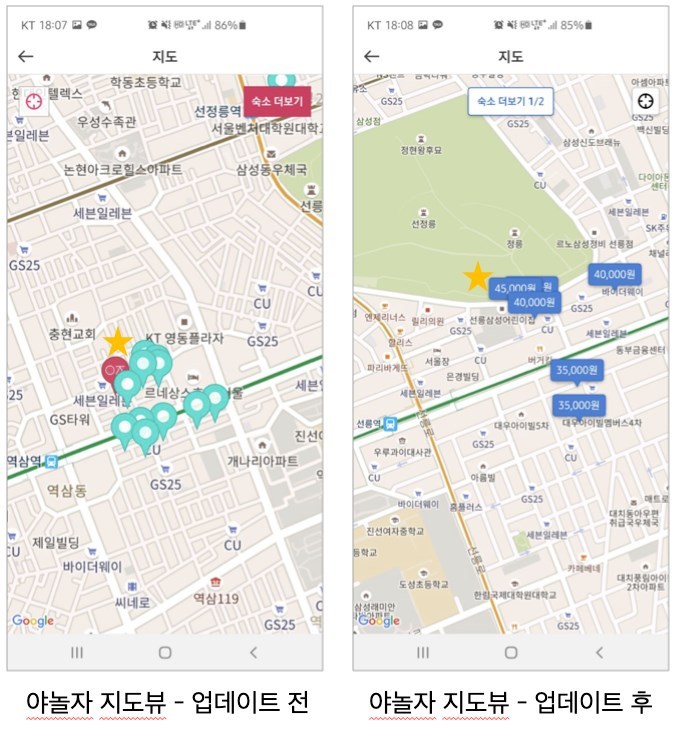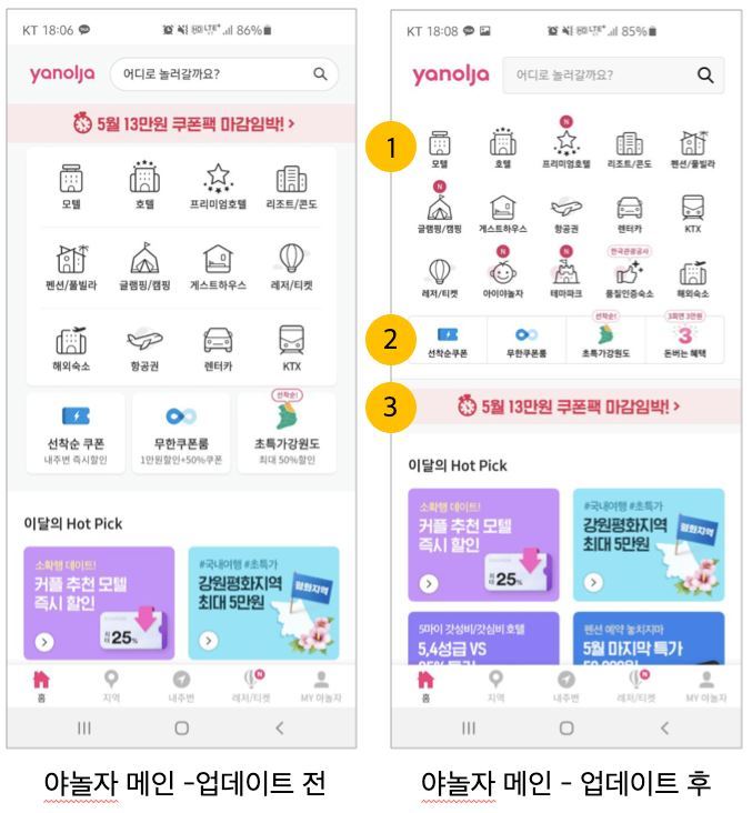 얼마 전 야놀자가 메인 화면과 특정 지역 내 숙소를 지도에서 확인할 수 있는 화면을 개선했습니다.