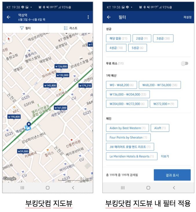 기존에 야놀자는 특정 지역 내 숙소들을 지도 위에 핀 형태로 보여줬습니다. 특정 핀을 선택하면 숙소 정보와 가격을 확인할 수 있었고요. 이 경우 위치만 대략적으로 확인하고 다시 특정 행동을 해야 구체적인 정보를 확인할 수 있는 흐름이 됩니다. 업데이트 후에는 핀이 아닌 가격 정보를 바로 확인 할 수 있도록 변경되었네요. 다른 서비스들은 어떤지 같이 비교하면서 의견을 덧붙여 보겠습니다.